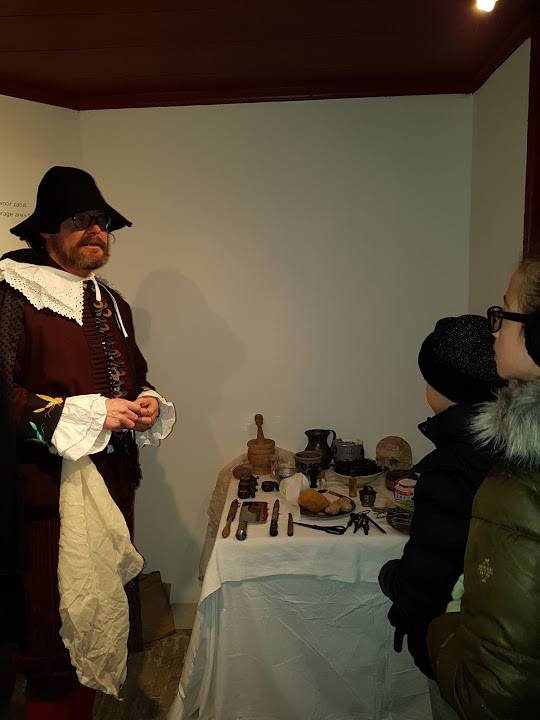 Onze oudste dochter mocht dienstmeisje zijn. Bob overhandigde haar een grote sleutelbos, waarmee zij de deuren binnen de Gevangenpoort kon openen. We startten bij de indrukwekkende cellencomplexen. Daar konden wij zelf ervaren hoe het in de Middeleeuwen was om met velen in een kleine, donkere, tochtige cel opgesloten te zitten.