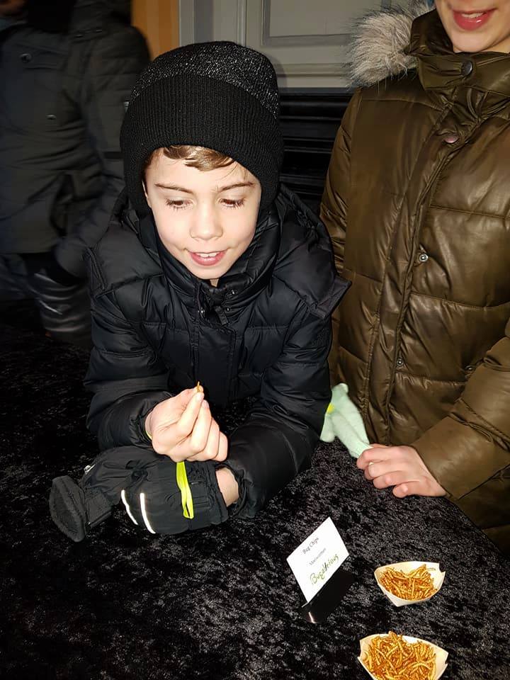 Bij de insectenproeverij van Bugalicious hoorden wij hoe voedzaam dit was en kregen wij de luxe versie voorgeschoteld. Op het menu stonden: krekelchips, chocosprinkhanen en meelwormenchips. Als deze mama thuis een onbekend gerecht voorschotelt, wordt dit vaak met gruwelgezichten ontvangen en het liefst puur ter informatie aangenomen. Mijn verbazing was dan ook groot toen heuse insecten in beide kindermondjes verdwenen. Bij de jongste gevolgd door de vraag of ze er nog een mocht. Een bezienswaardigheid an sich.